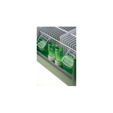 Cage de transport avec intérieur amovible et mangeoires extérieures.